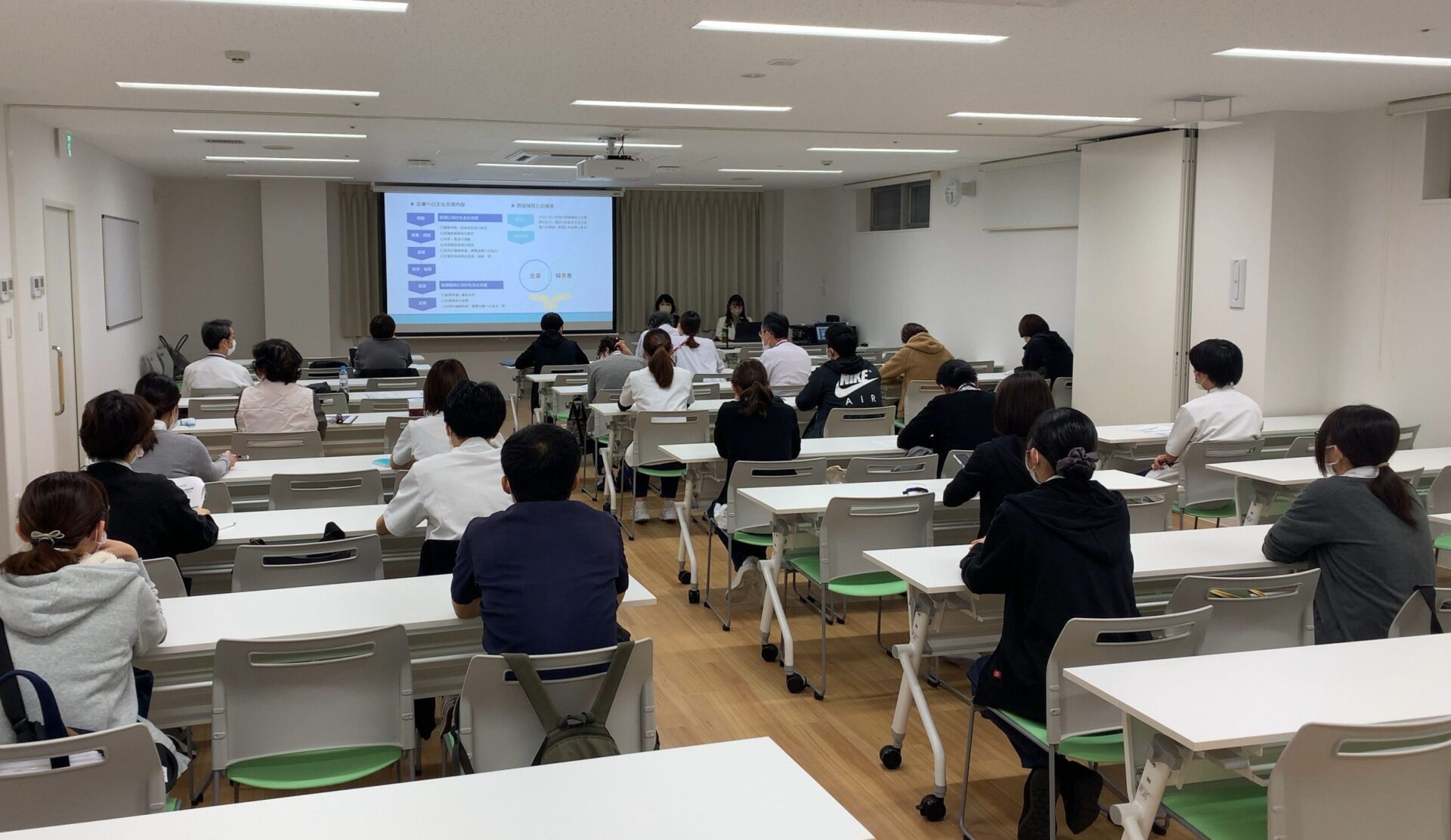 就業後にも関わらず、医師、MSW、OT、PT、など様々な職種の方に会場、オンラインでご参加いただきました。